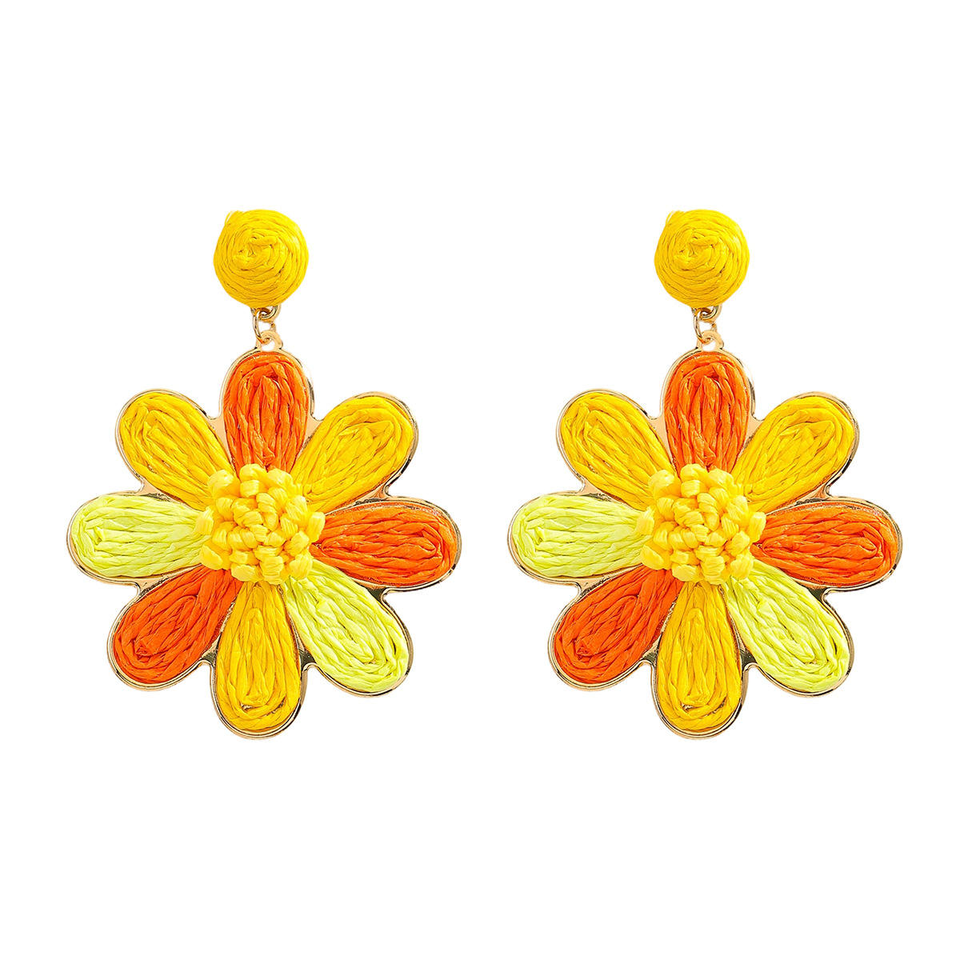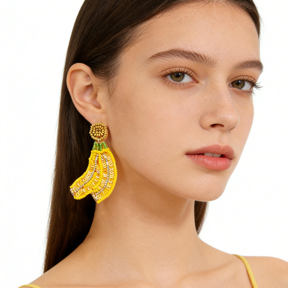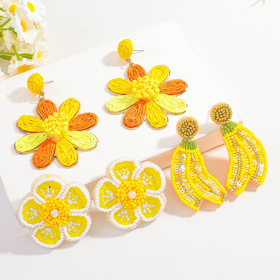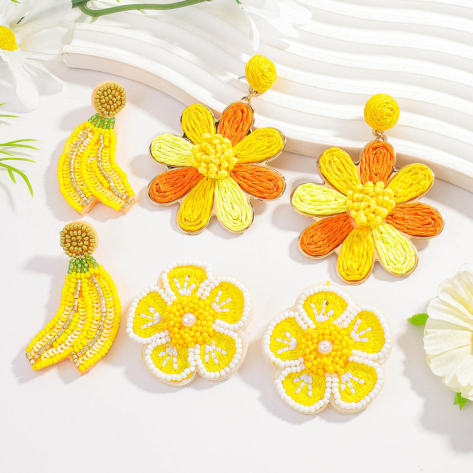 Pendientes Colgantes Boho Amarillos con Bordado de Frutas y Flores, Pendientes de Plástico con Cuentas de Plátano y Margarita para Mujer, Joyería de Verano