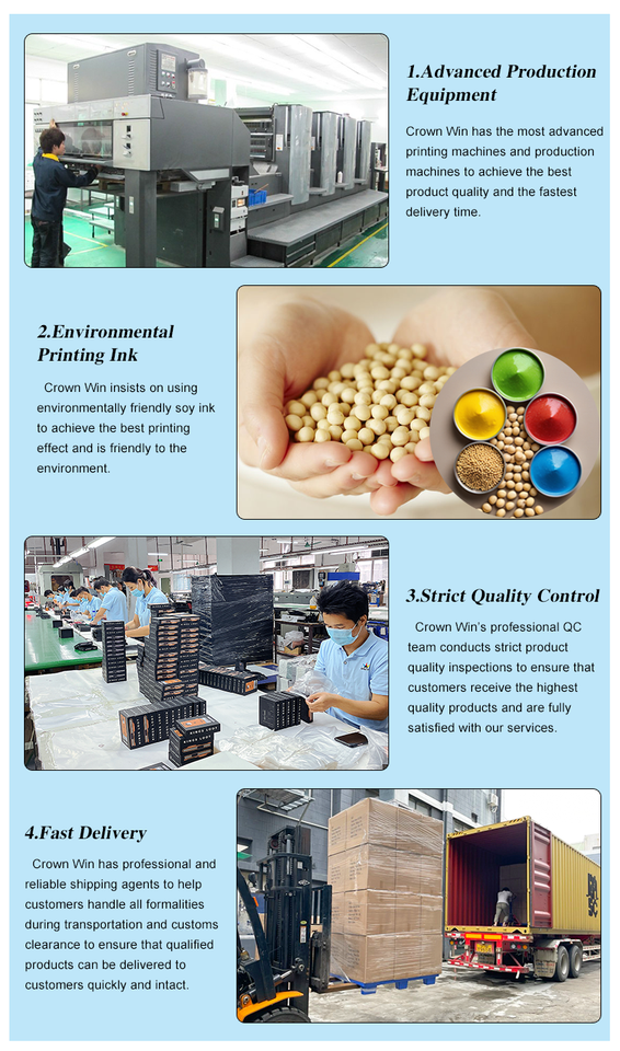 Tratamiento de impresión:Laminado mate, Barnizado, Estampado, Relieve, Laminado brillante, Recubrimiento UV, Desvanecimiento, Pan de oro, Cinta, EVA, PET VAC, Bandeja de papel o Esponja
