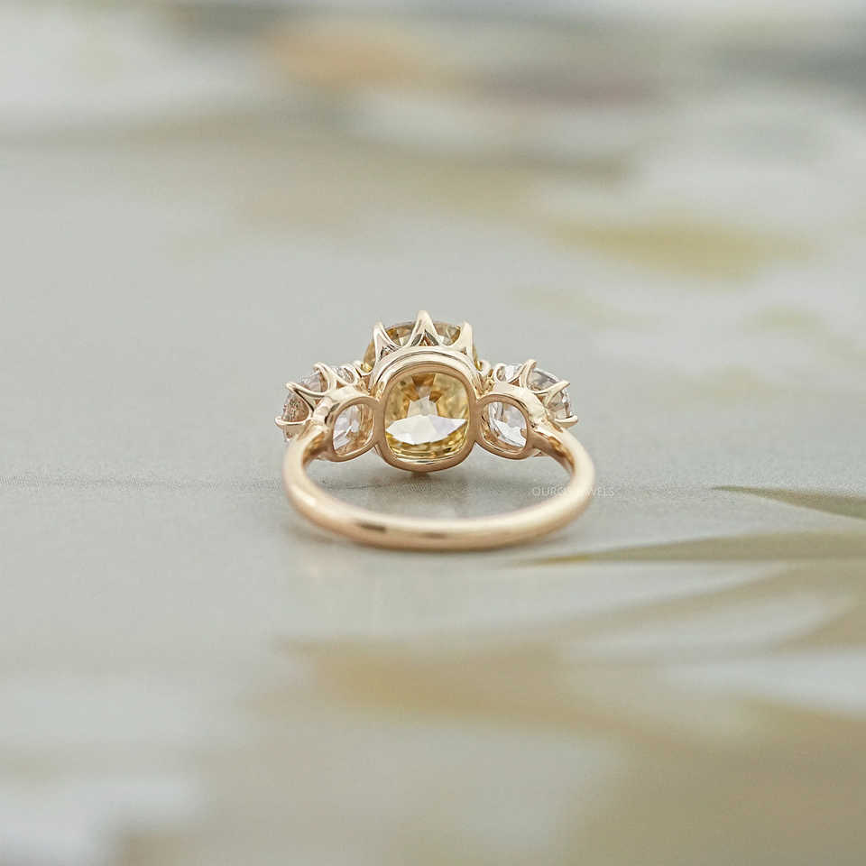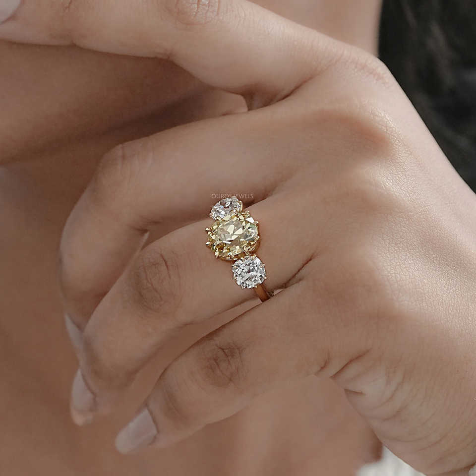 Bold Fancy Design Fancy Yellow Old Mine Cojín Diamante Anillo de tres piedras Anillo de diamante cultivado en laboratorio Piedra principal Anillo de oro sólido de 14K