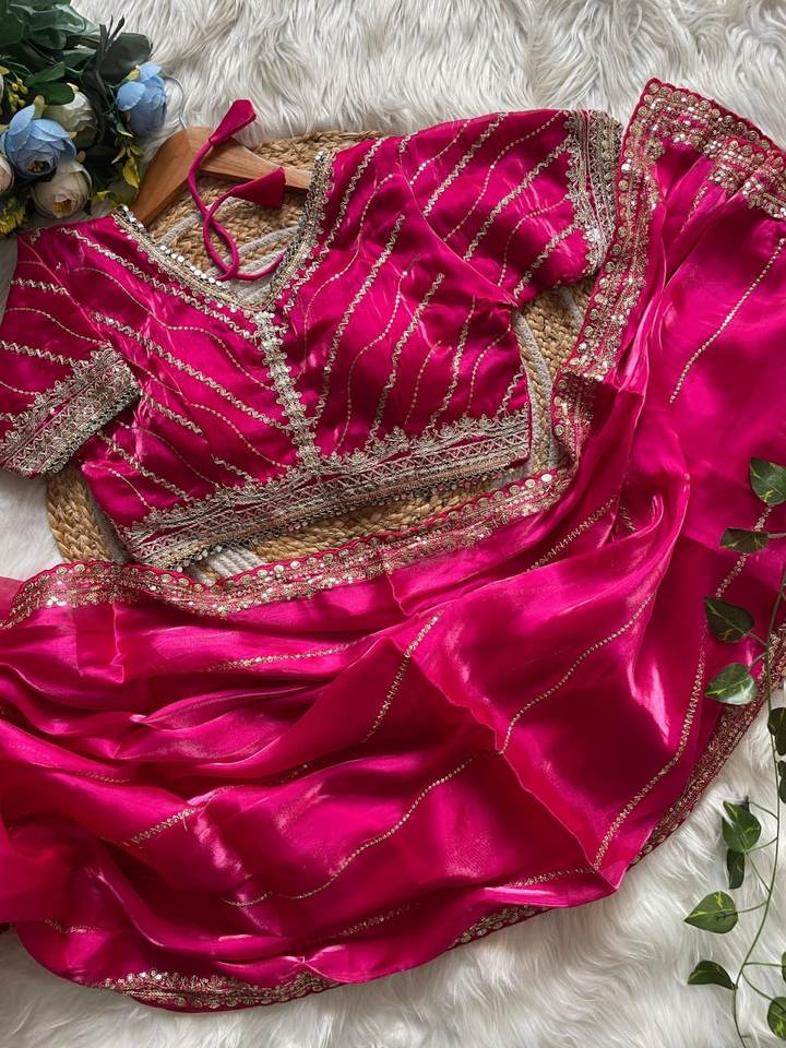 Saree de seda suave pura india de estilo Bollywood con borde de encaje de secuencia bordada y pieza de blusa, Sari de fiesta.