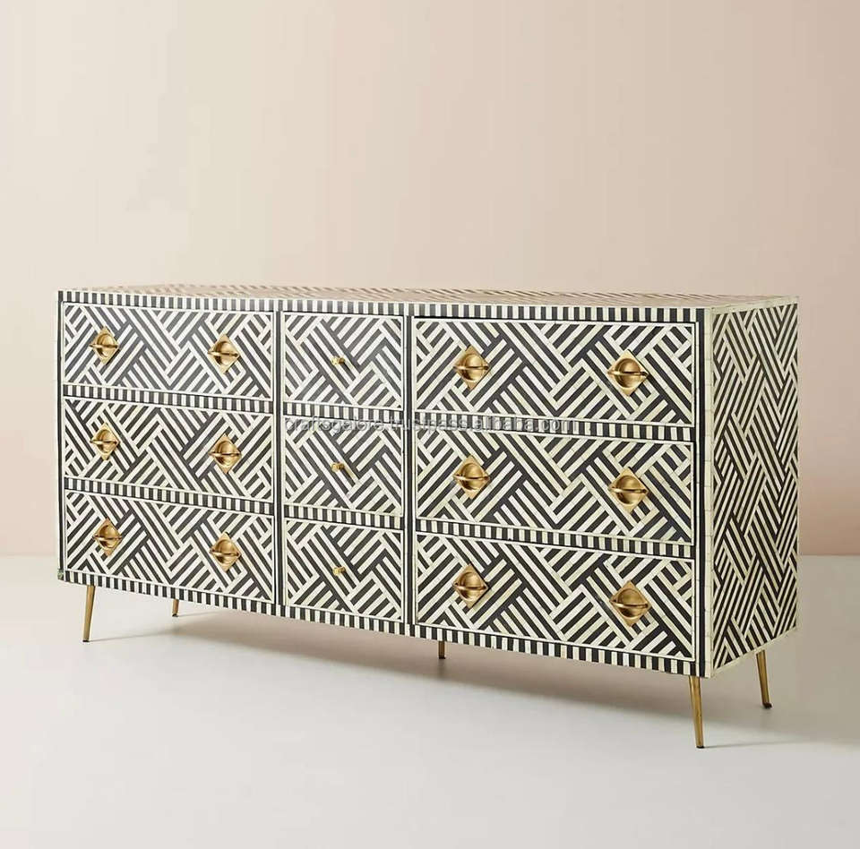 Consola con incrustaciones de hueso Diseño opulento Gabinete con incrustaciones de hueso para decoración funcional del hogar de la India a la venta a granel