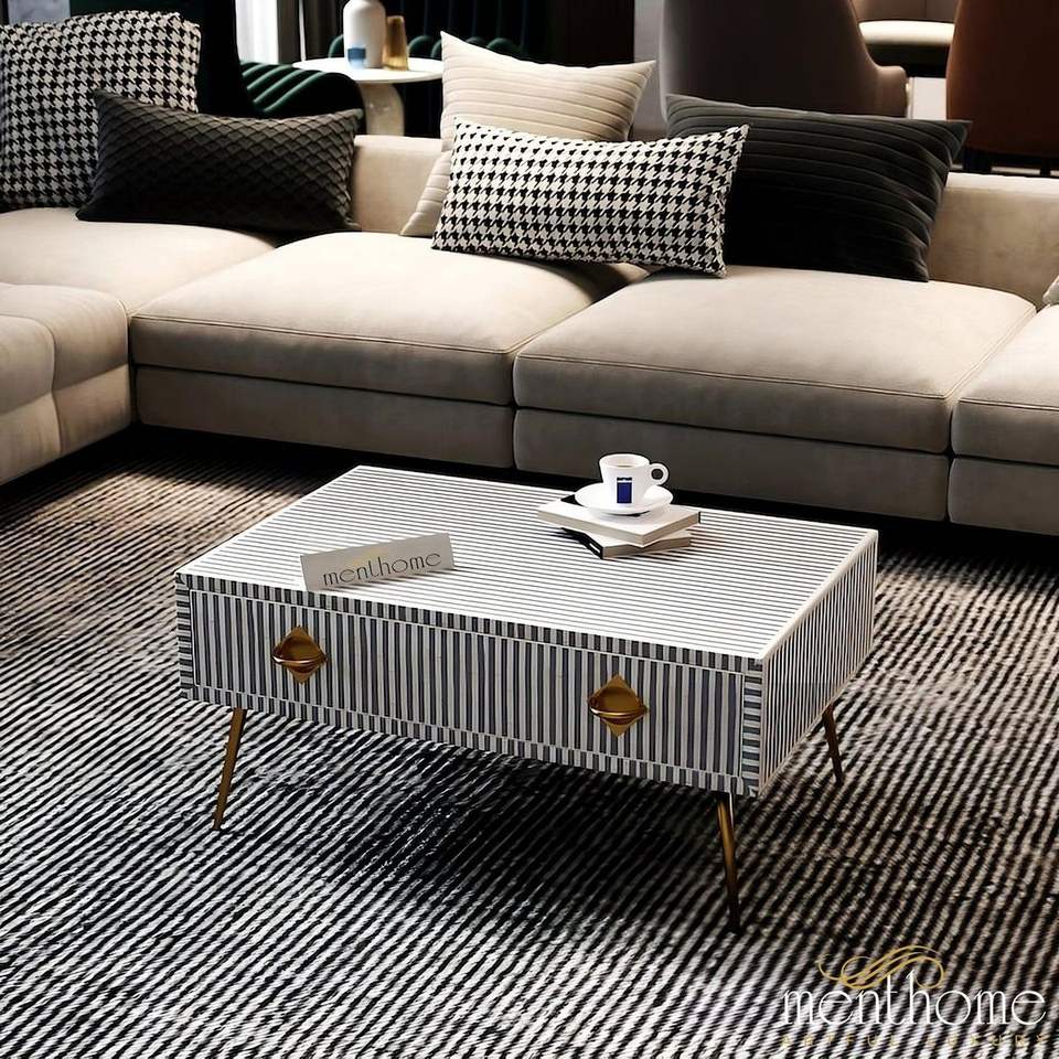 Mesa de centro con cajones y incrustaciones de hueso, mueble decorativo de madera hecho a mano de primera calidad para espacios de vida elegantes