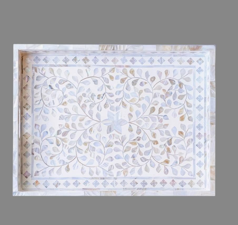Bandeja con Incrustaciones de Hueso, Diseño con Patrones Florales, Colores y Tamaño Personalizables, Bandeja para Servir con Incrustaciones de Hueso, Bandejas Indias de Hueso