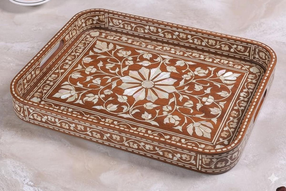 Bandeja con Incrustaciones de Hueso, Diseño con Patrones Florales, Colores y Tamaño Personalizables, Bandeja para Servir con Incrustaciones de Hueso, Bandejas Indias de Hueso