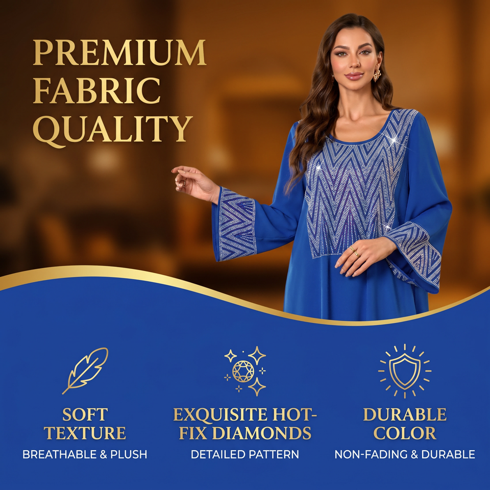 Vestido Modesto de la Colección Boutique, Azul Rey, Manga Larga, Maxi, Panel Geométrico con Hotfix, para Ocasiones como el Eid, Elegante, Silueta Holgada