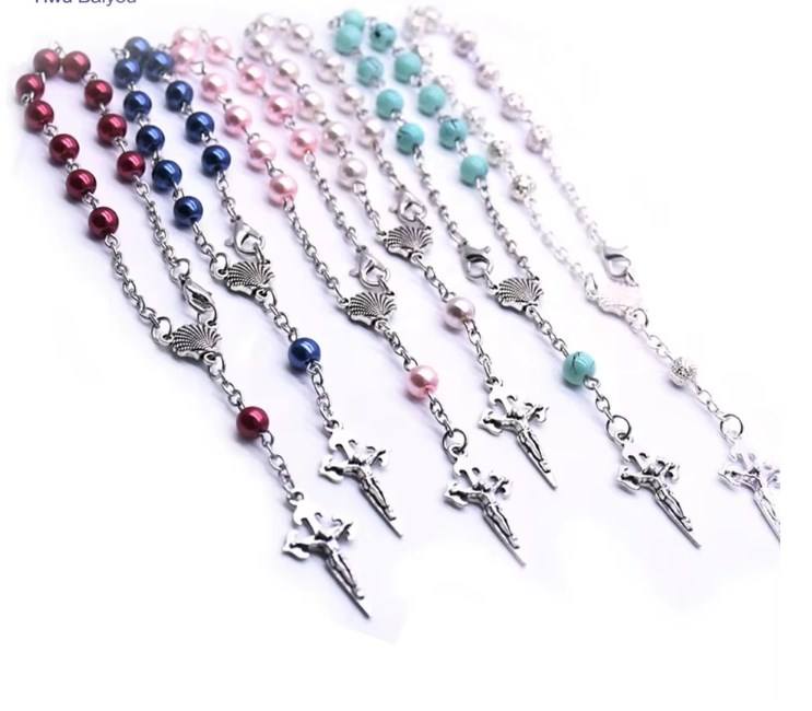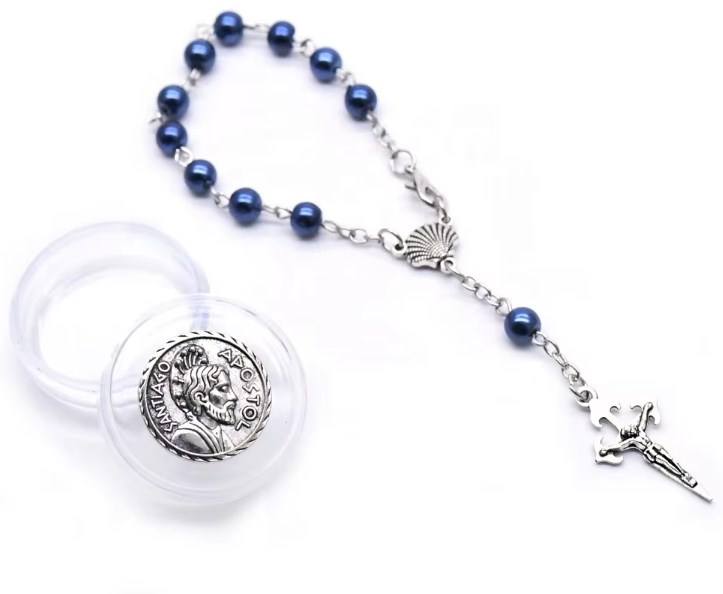 Conjunto de caja de pulsera de Rosario de perlas con Cruz de concha de Santiago, cuentas de oración de Catolicismo religioso, rosarios, regalo de aniversario en aleación