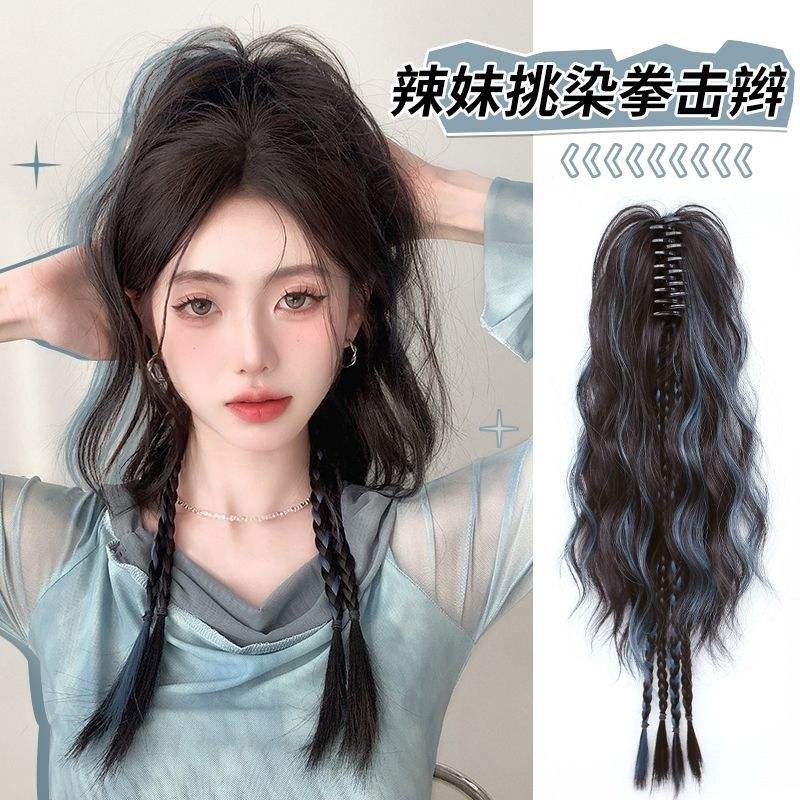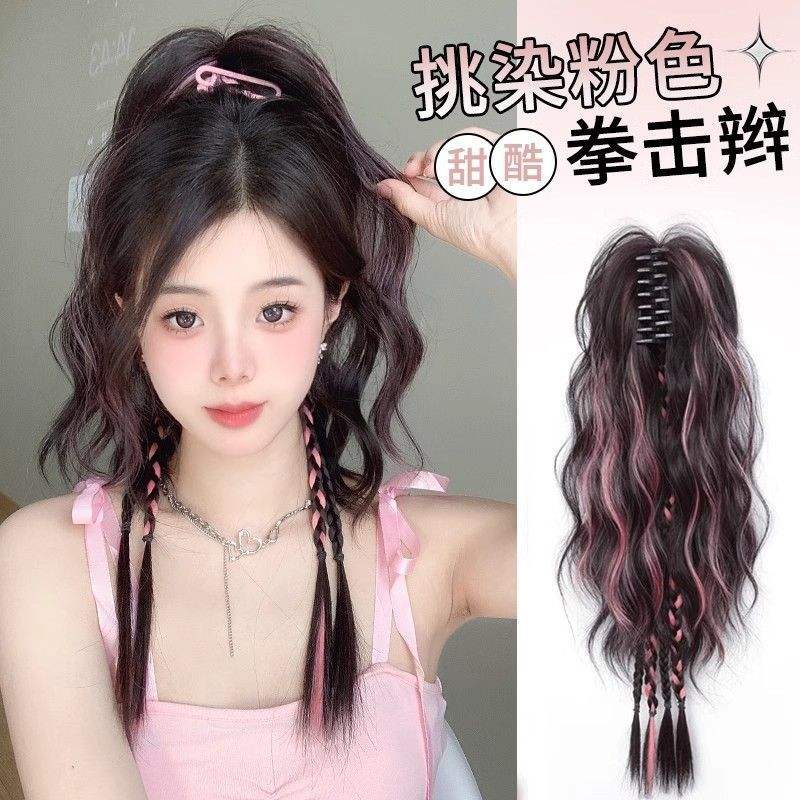 Peluca de cola de caballo con trenzas Boxer y reflejos, rizos en cascada, clip de pelo realista y esponjoso para mujer, material de alambre resistente a altas temperaturas