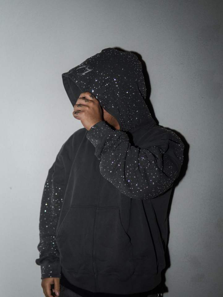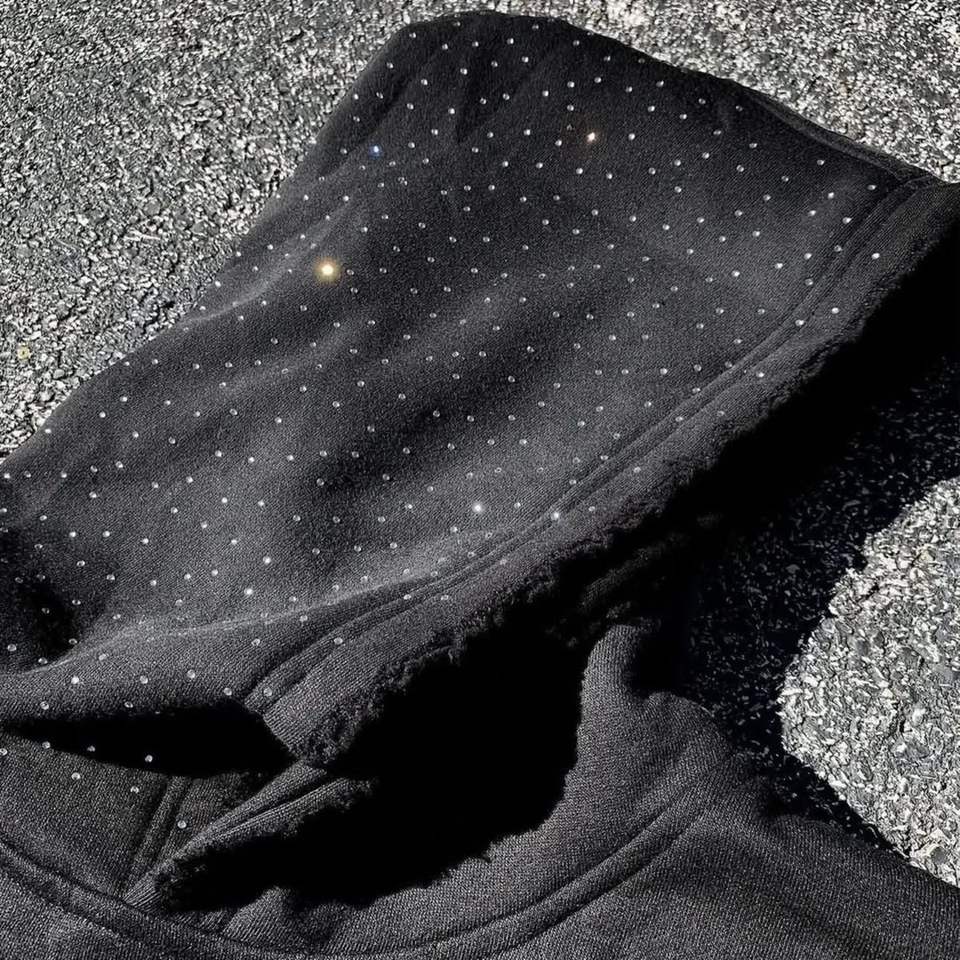 Sudadera con capucha unisex de ajuste regular, tejida, de poliéster y algodón de alto gramaje, personalizada al por mayor, con diseño bordado de pedrería y efecto lavado.