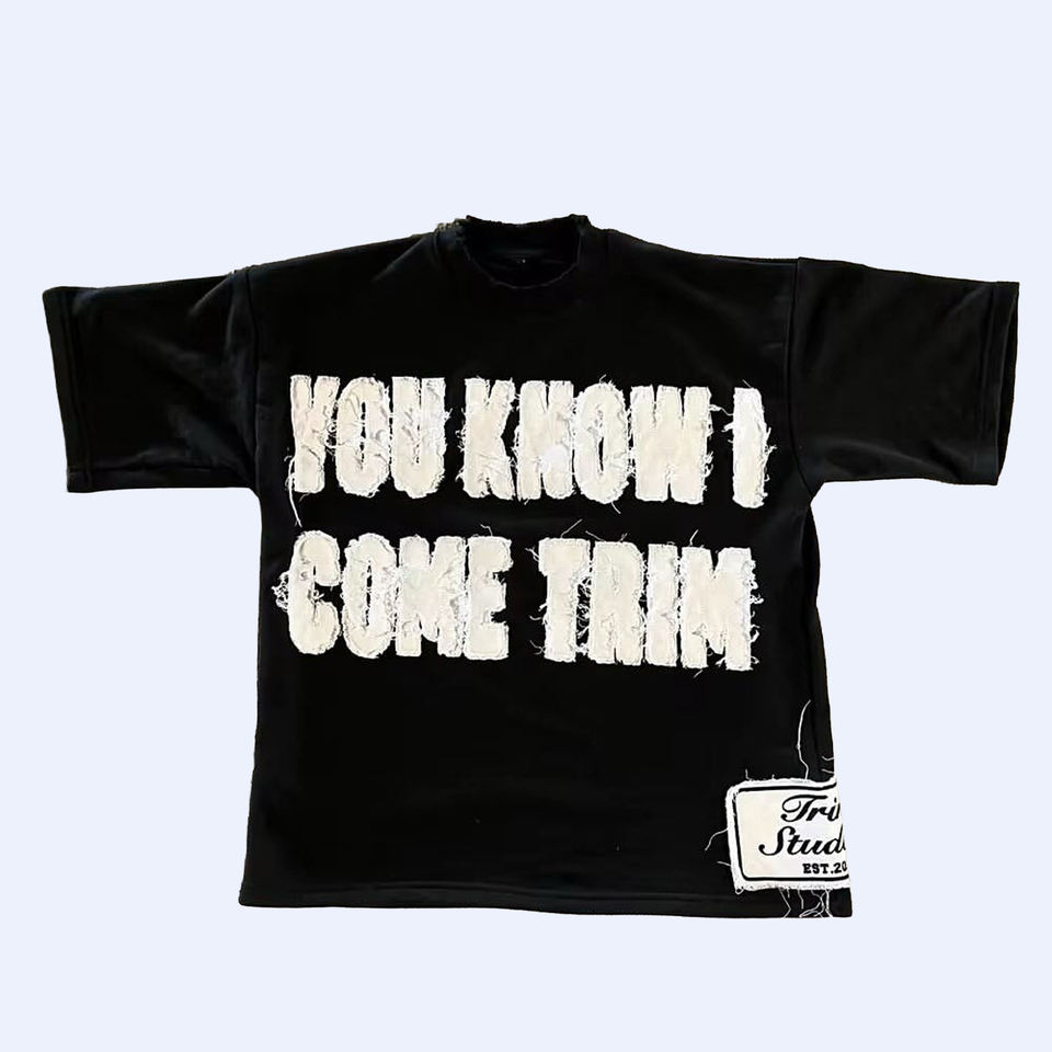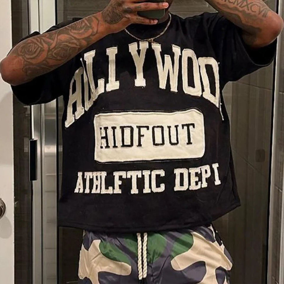 Camiseta de manga corta de sarga con cuello alto, estilo oversize, desgastada, con bordado y parche personalizado
