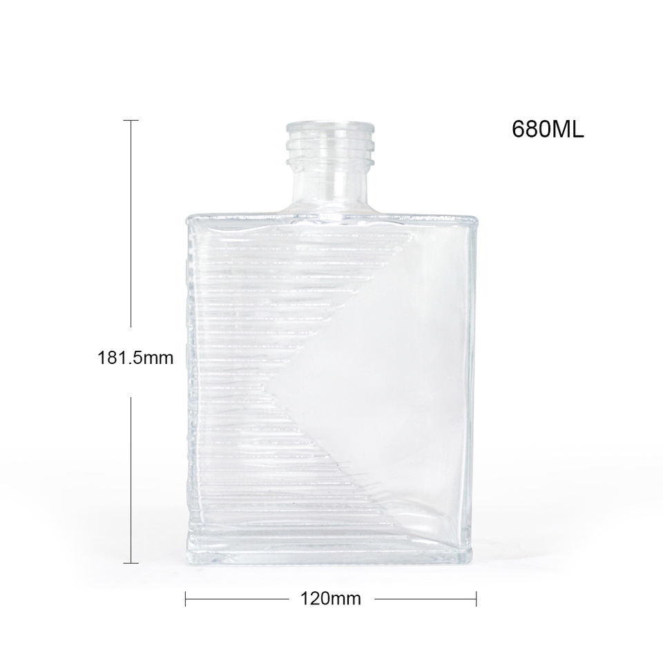 Autorización de marca 680ml Forma innovadora cuadrado Diseño en relieve Botella de vidrio Licores de lujo Whisky con tornillo