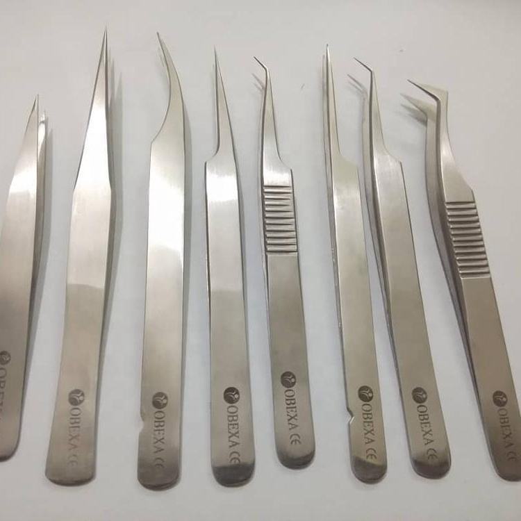 Juego de 8 Pinzas para Extensión de Pestañas de Acero Inoxidable Mate Marca Obexa, Superficie de Contacto Ultra Larga, Punta en Ángulo de 90 Grados