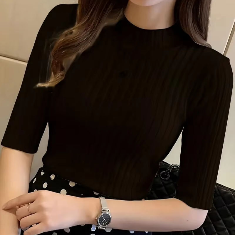 Nueva y elegante Camiseta de manga corta de punto acanalado, camiseta elegante sólida, suéter de poliéster 100% para mujer, ropa de mujer de Bangladesh