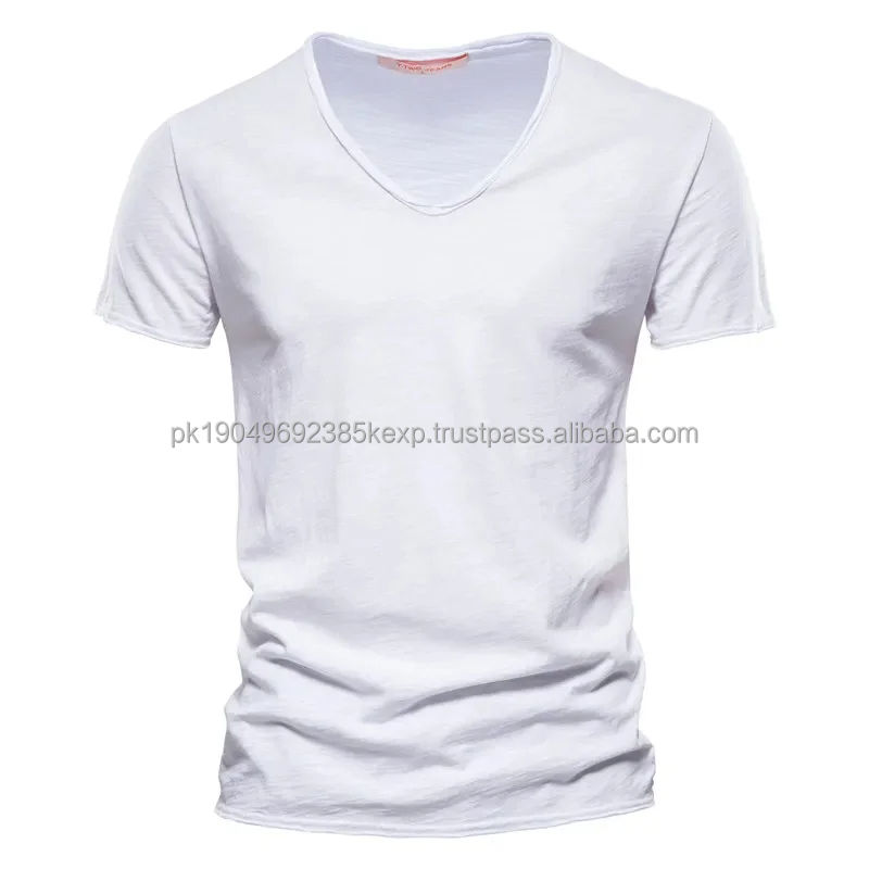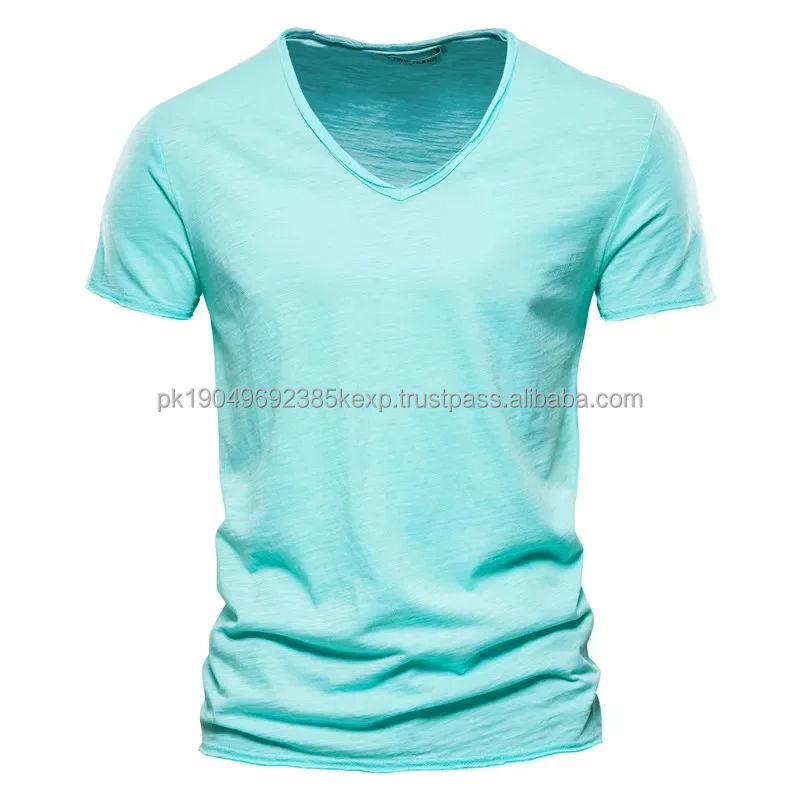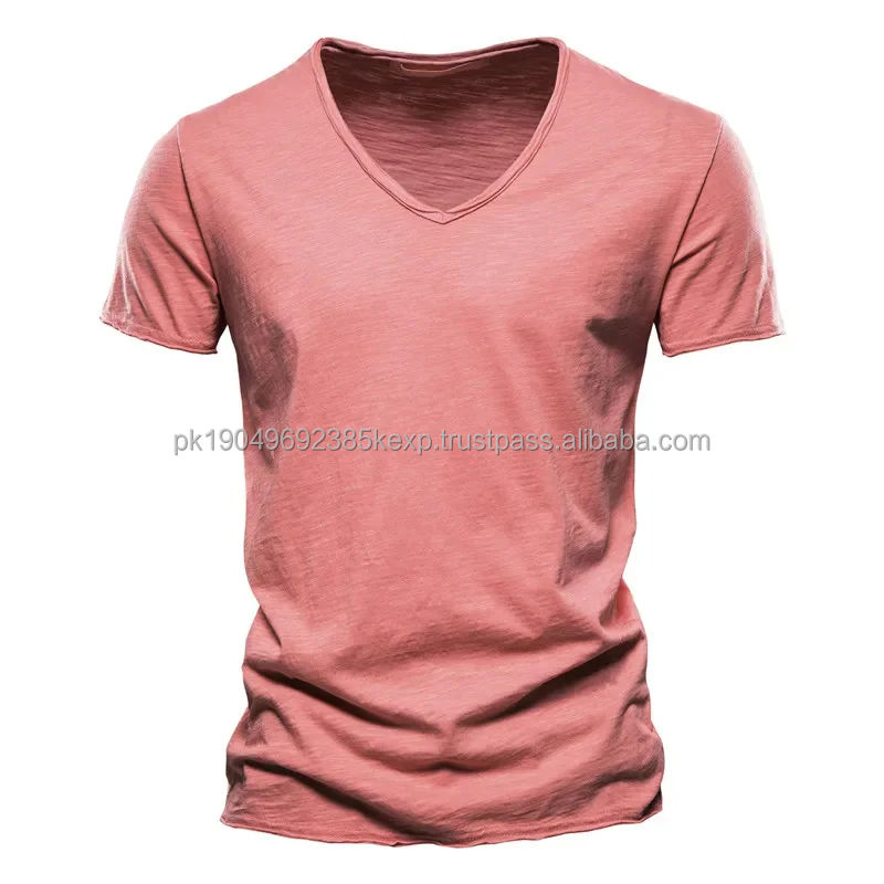 Camiseta de Cuello en V de Algodón 100% de Calidad de Marca para Hombre, Diseño Moderno, Corte Ajustado, Manga Corta, Patrón Liso, Tejido de Punto