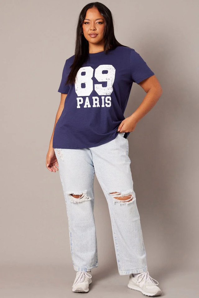 Camiseta de Jersey gráfico numérico azul de algodón de gran tamaño para mujer de talla grande de marca para mujer ropa de verano OEM ODM al por mayor Bangladesh