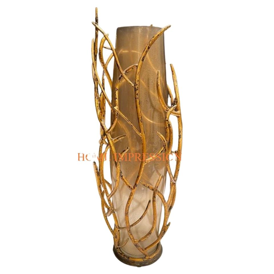Ramas de latón Diseño de jarrones y macetas de metal de color dorado Accesorios de mesa de vidrio transparente Florero clásico hecho a mano para sala de estar