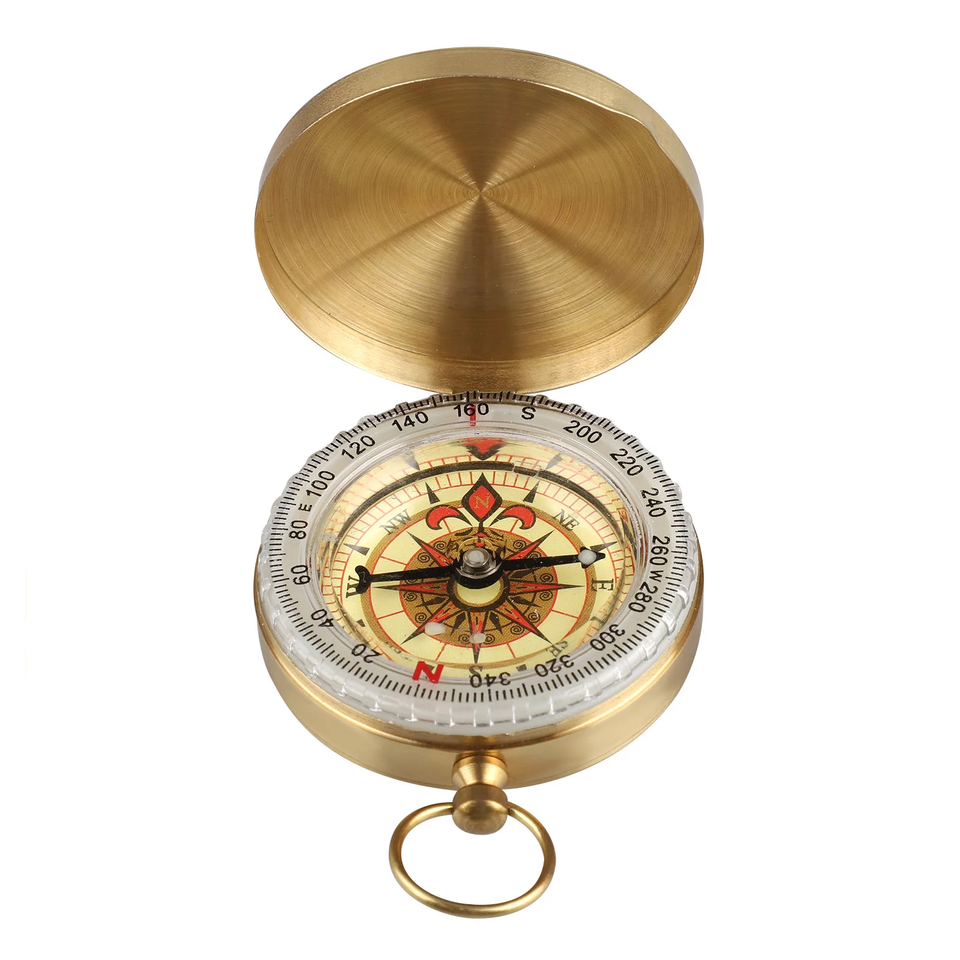 Artilugios de diseño de latón para acampada y deportes, brújula dorada, con Funda de cuero, embalaje luminoso de alta calidad