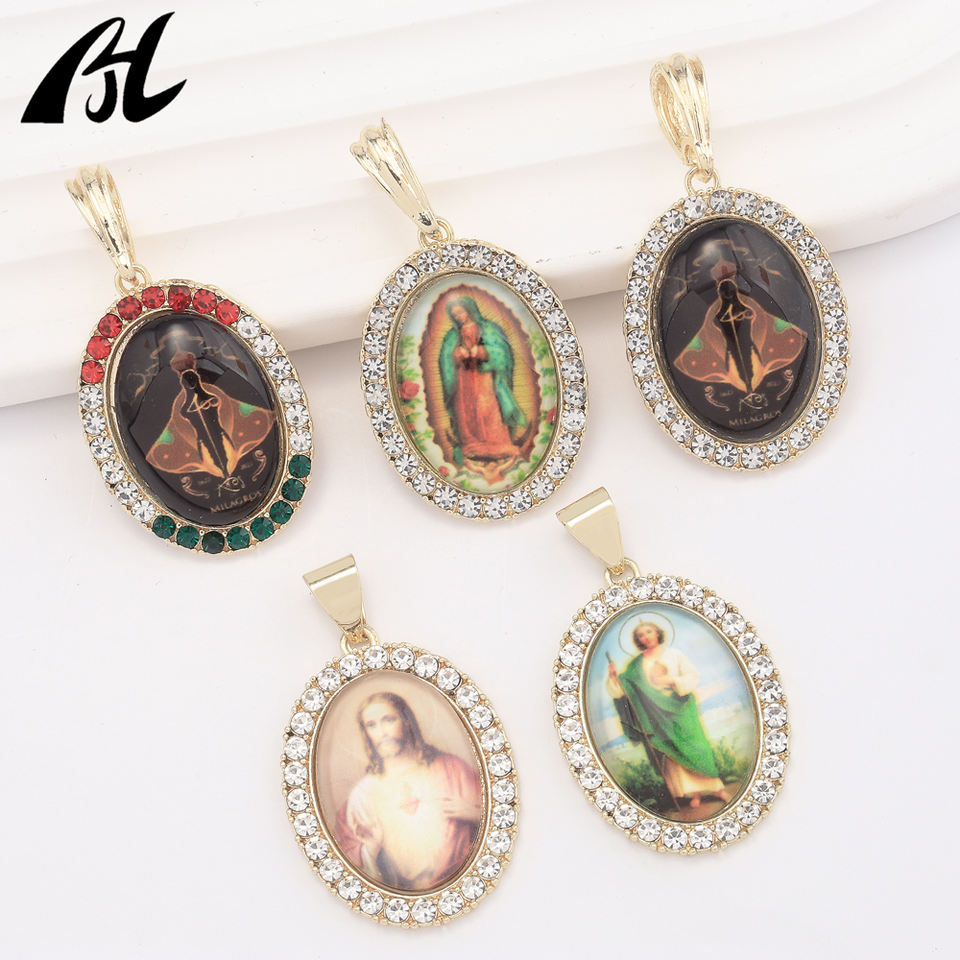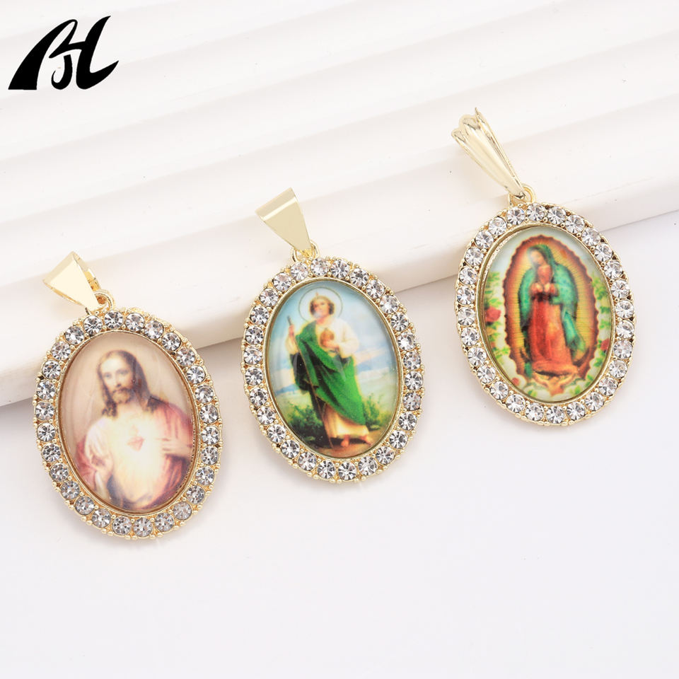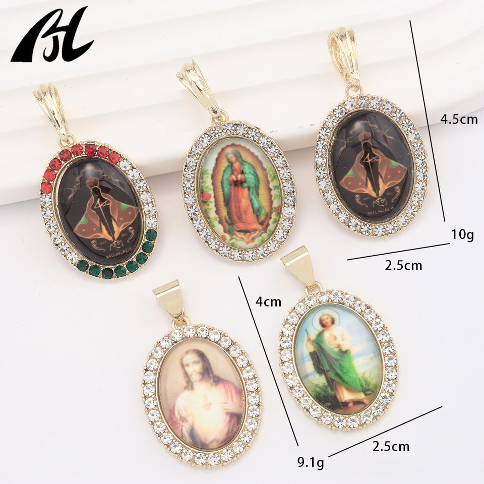 Colgante de Latón de la Virgen María y Jesús, Joyería de Moda Dorada para Cristiano Hip Hop, Medalla Bendita Elíptica para Foto Recuerdo y Oración, Bendecido por la Fe
