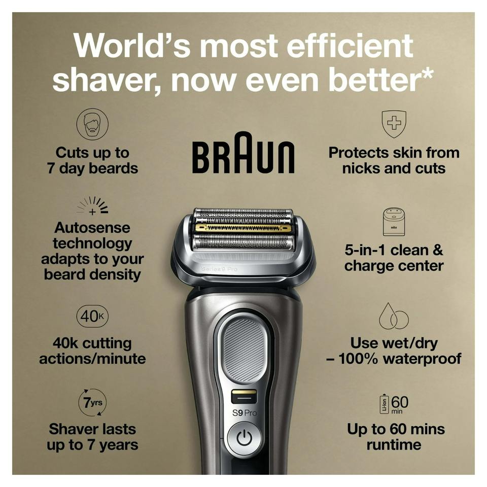 Maquinilla de afeitar eléctrica Braun Series 9 Pro para hombres con estación limpia, afeitadora recargable en seco y húmedo, 9465cc, metal noble