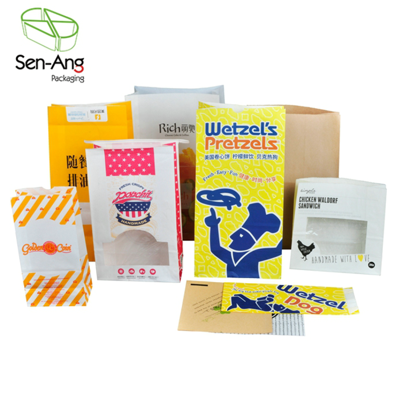 Bosheng marrón papel Kraft bolsas de pan a prueba de grasa ocho sellos laterales ventana de visualización desechable tamaño personalizado para pizza de gelatina