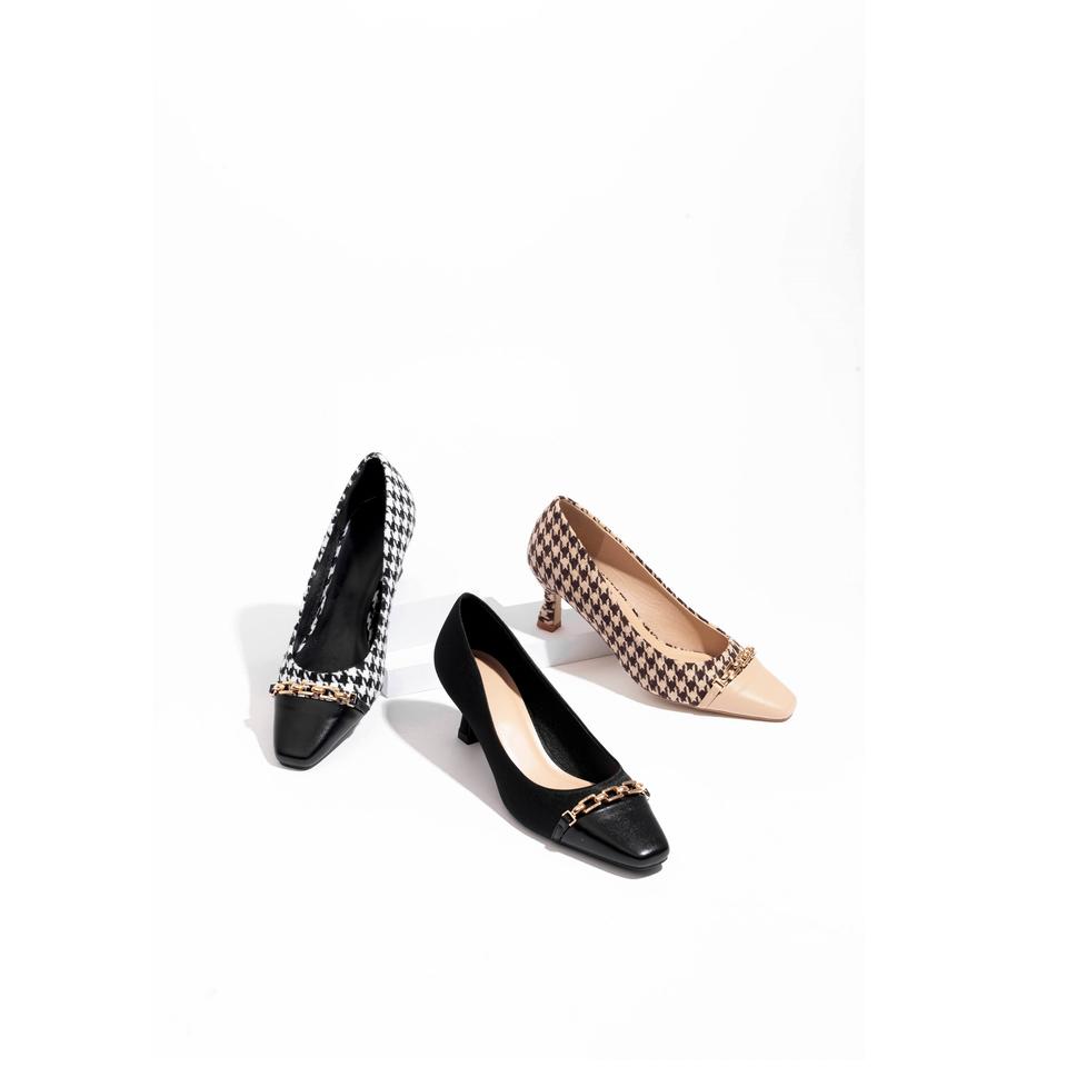 Descripción del producto:Tejido de tweed con punta de PU-adorno de cadena-Tacón de 5 cm