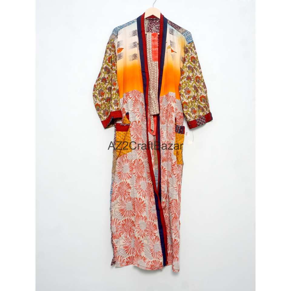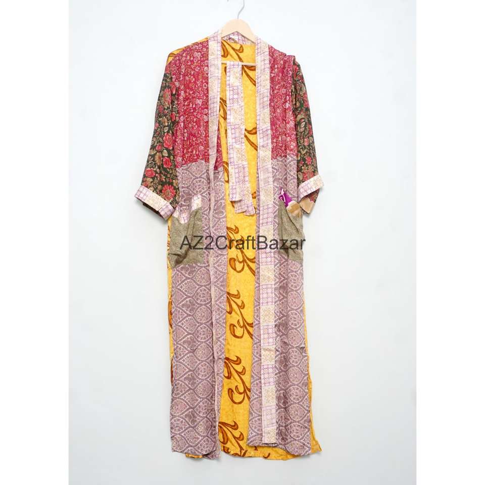 Bata de Novia Ligera de Seda Transpirable y Suave para Mujer, Ropa de Dormir Larga, Kimono de Seda Reciclada Estilo Sari Indio Vintage con Logo Trasero, Verano