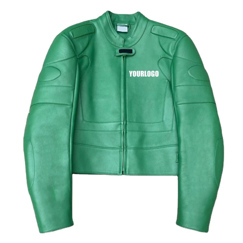 Chaqueta de Cuero Verde Brillante con Cremallera YKK, Bolsillos para Armadura, Estilo Motociclista, Cuello Redondo, Hombreras Acolchadas, Invierno, Unisex