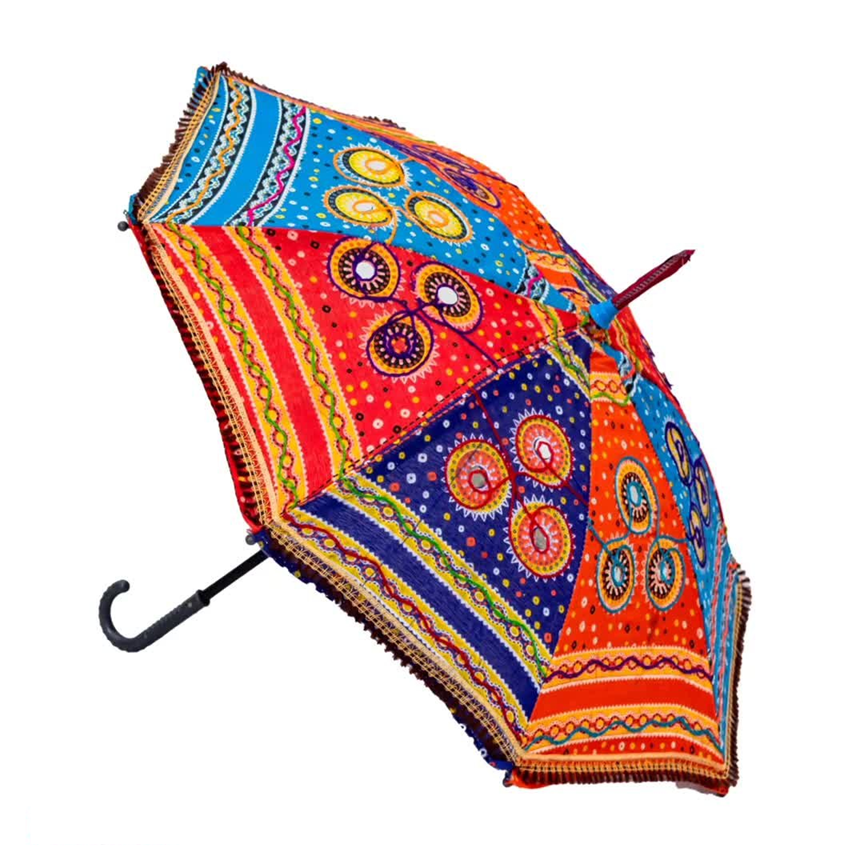 Sombrilla Rajasthani con base naranja brillante, bordado rosa elaborado, decoración festiva, totalmente espejada, a precios de mayorista.