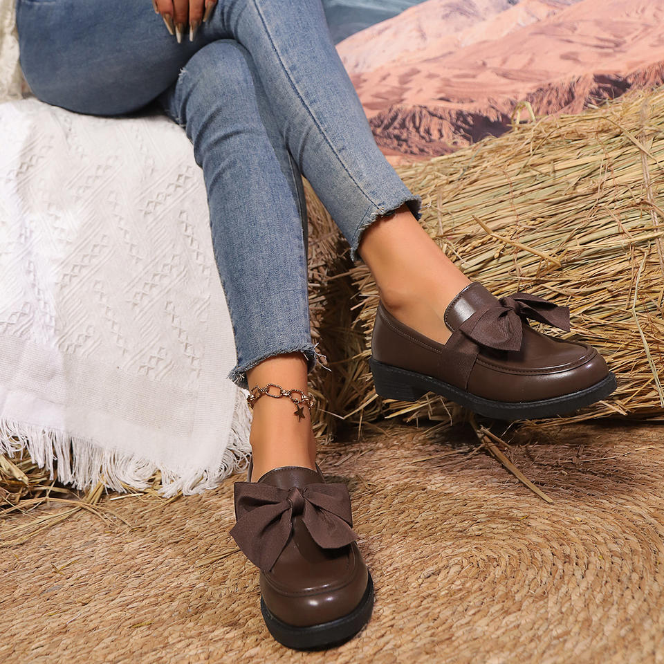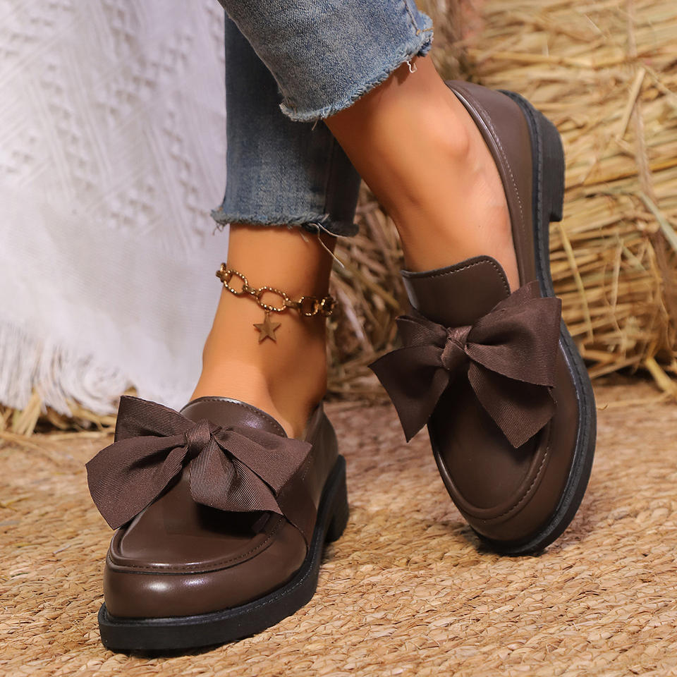 Zapatos Planos Retro de Otoño con Lazo Grande Estilo Británico, Zapatos de Tacón Grueso de Cuero para Mujer