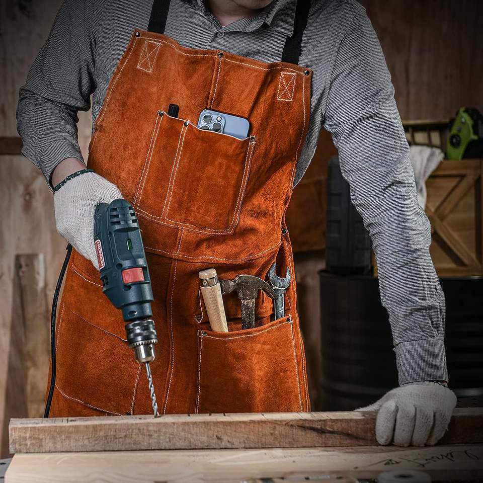 Delantal de soldadura de cuero marrón-Babero resistente al calor y al fuego con 6 bolsillos para mayor seguridad y comodidad