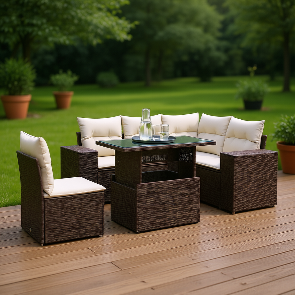Conjunto de sofá de jardín de ratán marrón con estructura de acero con recubrimiento en polvo y mesa de vidrio templado para uso en exteriores.