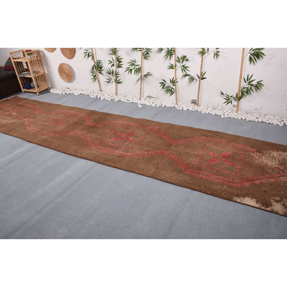 Alfombra de lana rosa marrón con patrón geométrico bohemio diseño de rompecabezas rectangular de retazos hecho a mano para cabecera de entrada 3,4X15,3 pies