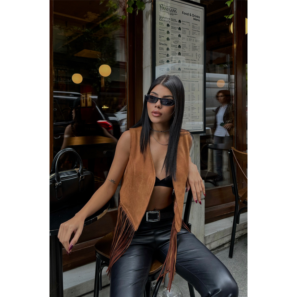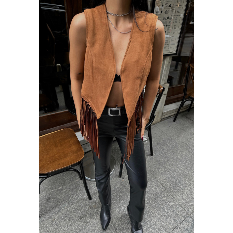 Chaleco de Gamuza Marrón con Flecos, Bordado y Logotipo Vintage en Tela Tejida, Corto, para Trajes