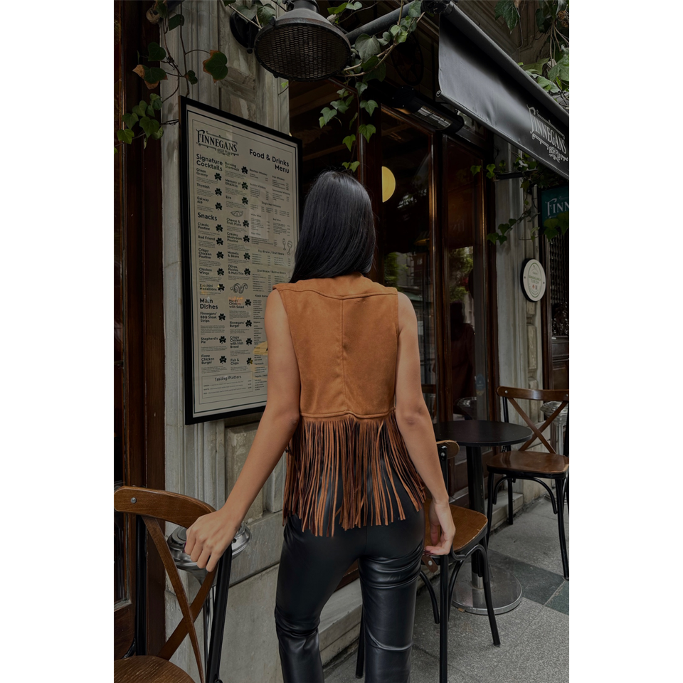 Chaleco de Gamuza Marrón con Flecos, Bordado y Logotipo Vintage en Tela Tejida, Corto, para Trajes