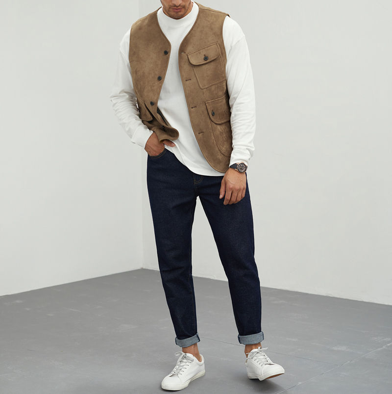 Chaleco de Cuero Vintage sin Mangas Estilo Gamuza Suave Color Camel Marrón con un Bolsillo de Parche y Cierre de Botones para Hombre Otoño