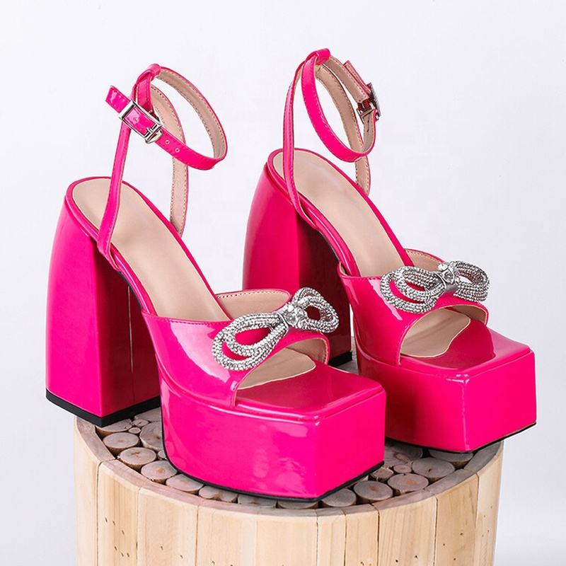 Zapatos de tacón alto con correa de hebilla y punta cuadrada abierta, de charol con lazo brillante, tacón grueso, plataforma sexy para exteriores