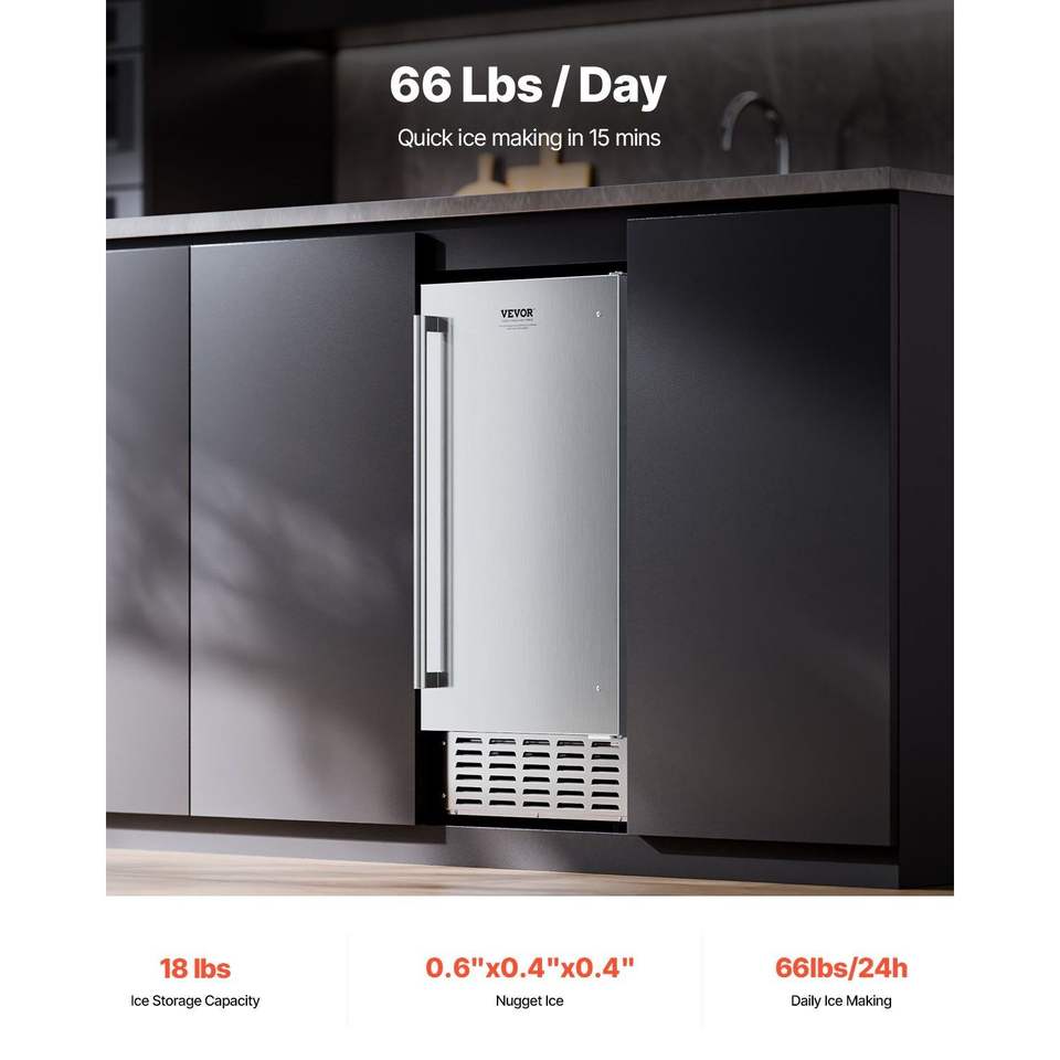 Máquina de Hielo en Cubitos Integrada de Acero Inoxidable, 66 Lbs/Día, con Puerta Reversible, Nueva