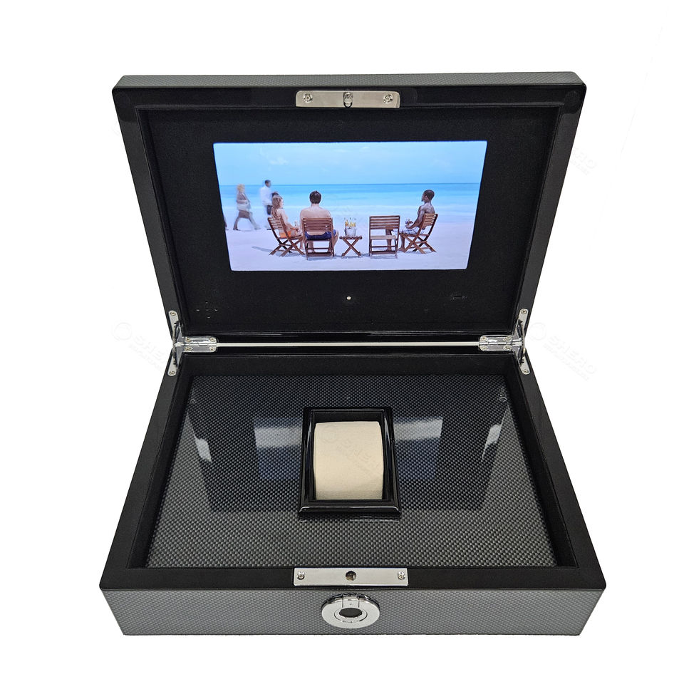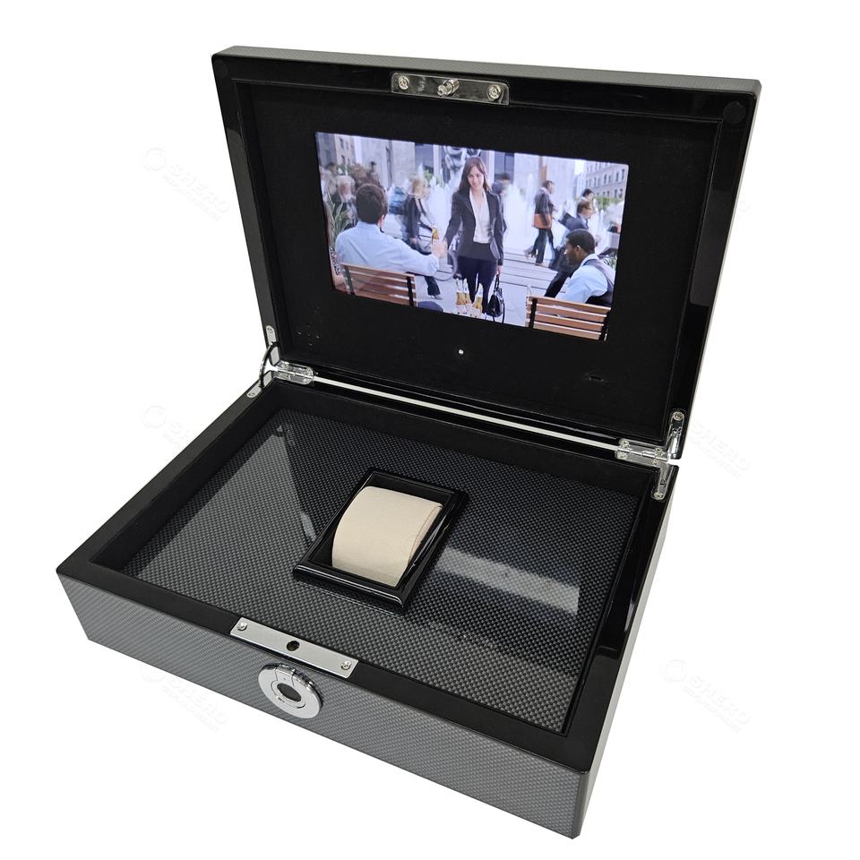 Tapa de pantalla digital integrada e interior de terciopelo para relojes de lujo Caja de reloj de madera de laca negra elegante