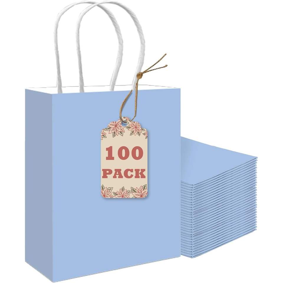 Paquete de 100 Bolsas de Regalo de Papel Azul Claro con Asas, 8.3 x 3 x 6 Pulgadas, Tamaño Pequeño para Múltiples Propósitos, Incluidos Recuerdos de Fiesta