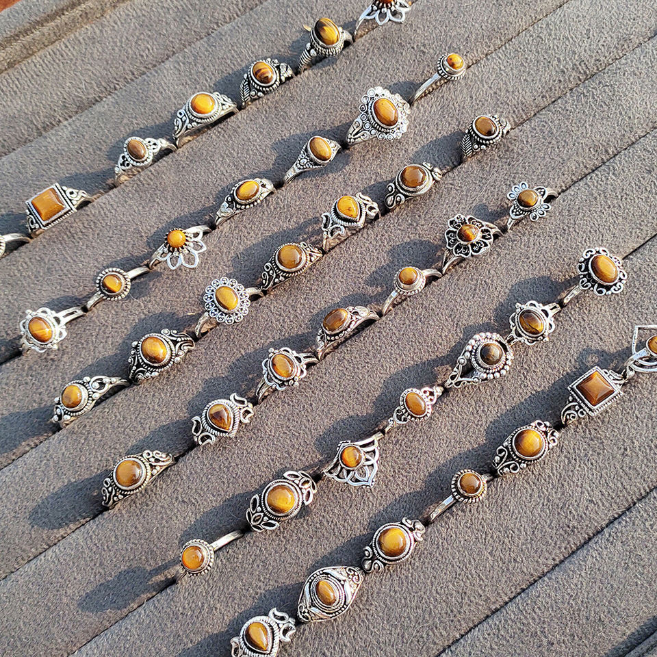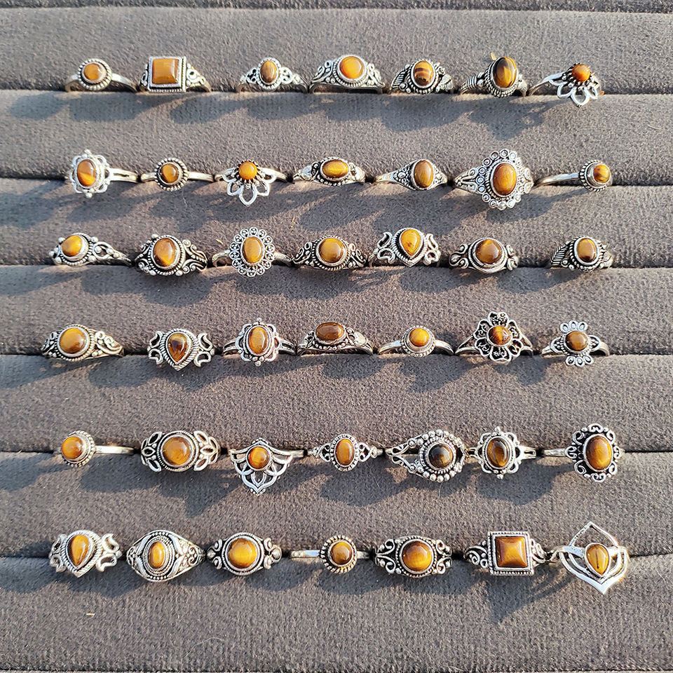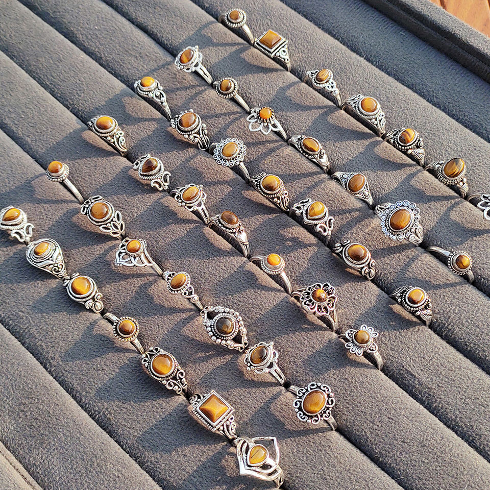 Anillos de latón con ojo de tigre a granel, engaste de bisel, chapado en plata oxidada antigua, joyería bohemia vintage surtida para bodas