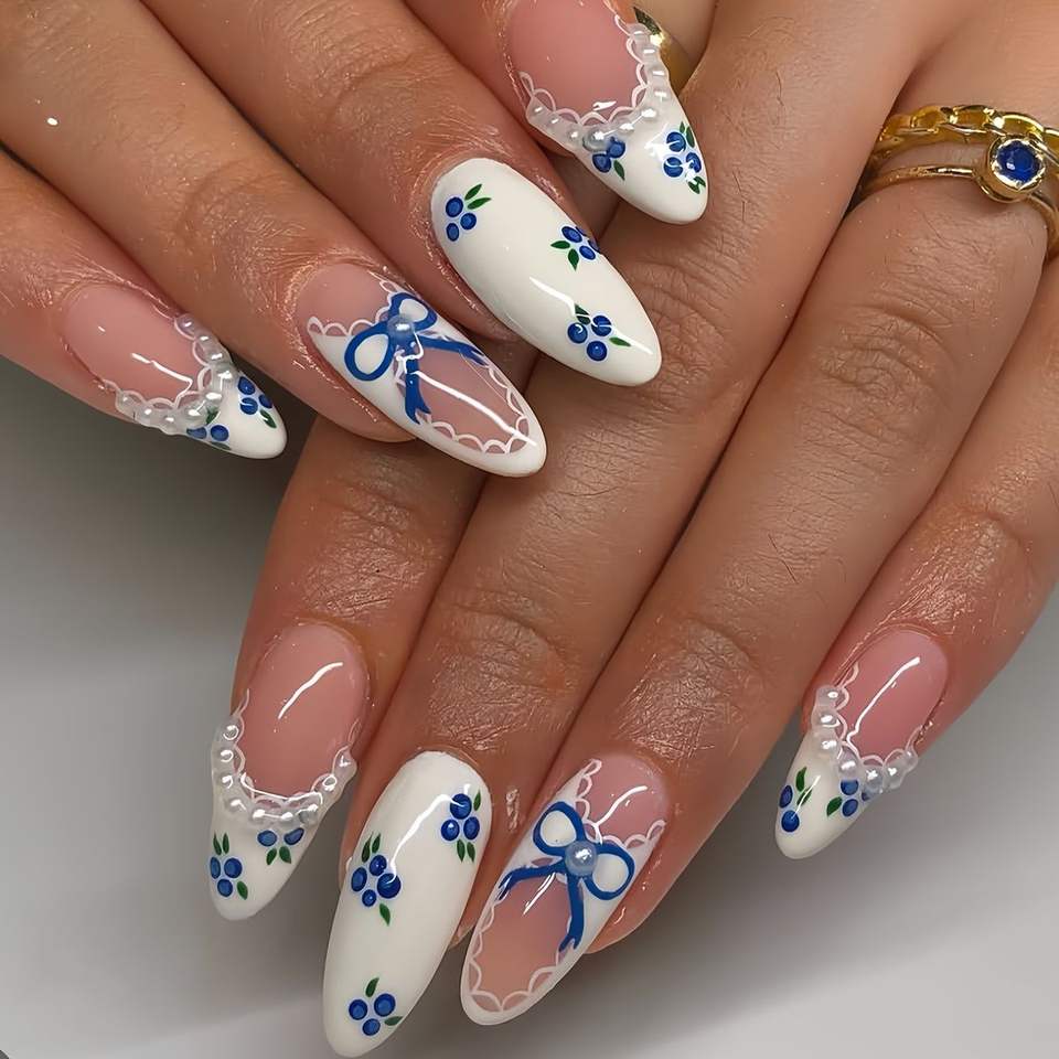 Diseño:Lazo azul pintado a mano en 3D con encaje de perlas y arándanos