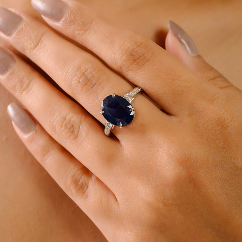 Anillo de Compromiso de Oro Blanco K18 con Zafiro Azul de 5 Quilates y Diamantes, Diseño de Alta Calidad para Mujer, Venta al Por Mayor