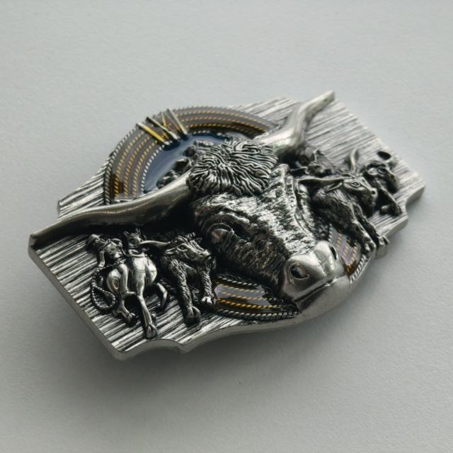 Hebilla de cinturón de cabeza de toro con escena de rodeo