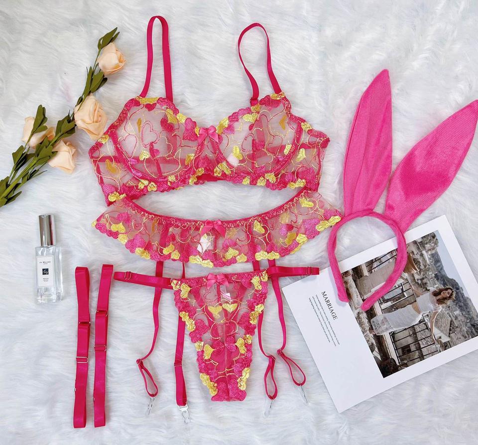Bunny Girl Erotic Bralette G-string Ropa interior Conjunto de 5 piezas con Orejas de conejo Hollow Out Lace Conjuntos de sujetador de lencería sexy para mujer