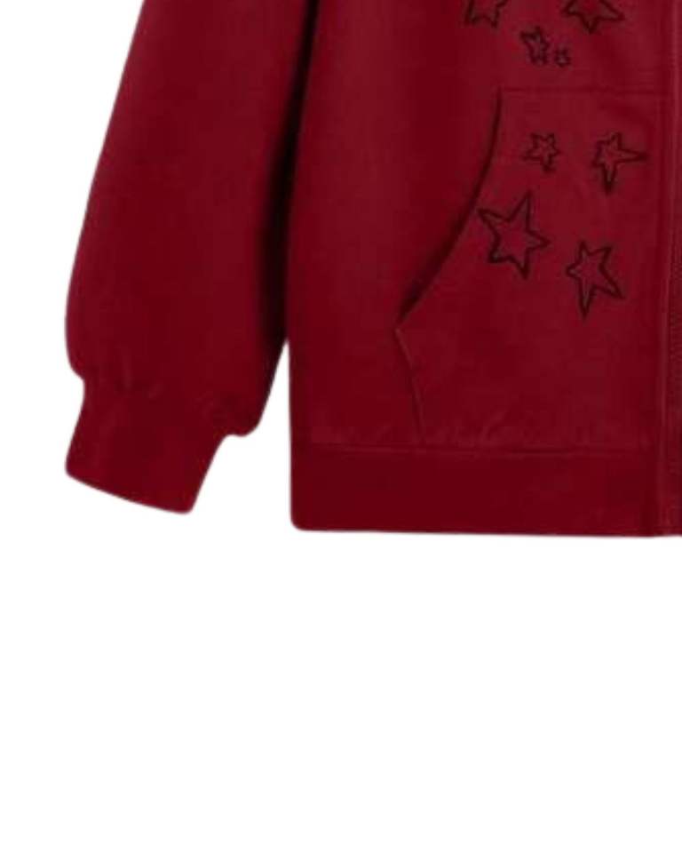 Sudadera con Capucha y Cremallera Bordada con Estrella Borgoña para Mujer, Sudadera Informal de Invierno de Manga Larga con Forro Polar Suave