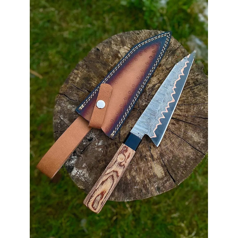 Cuchillo de Chef Burraq Hecho a Mano con Acero de Damasco, Mango de Madera, Funda de Cuero, Hoja de 7 Pulgadas, Grosor de 3.0 mm, Apto para Lavavajillas, Nuevo