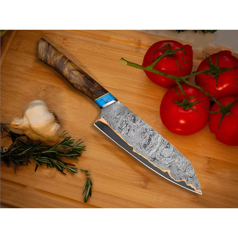 Cuchillo de Chef Burraq Hecho a Mano con Acero de Damasco, Hoja de 7 Pulgadas y 3.0 mm de Grosor, Funda de Cuero Premium, Mango de Madera
