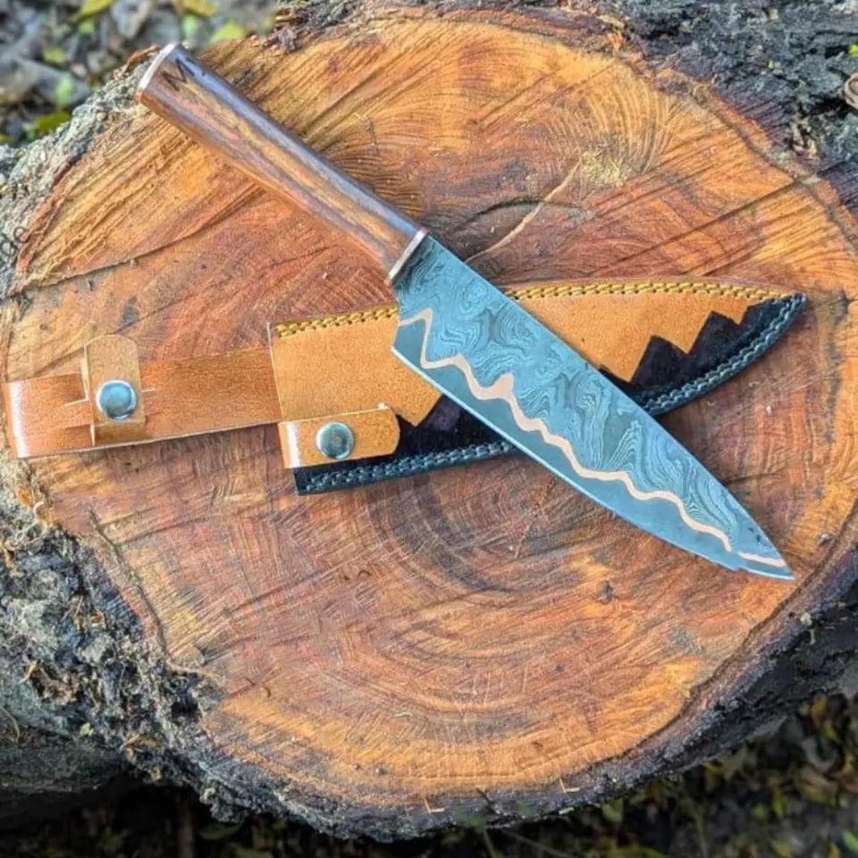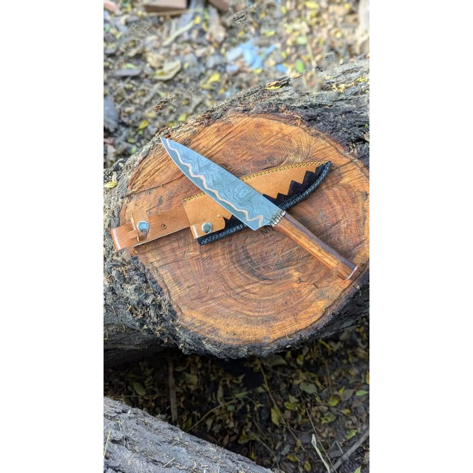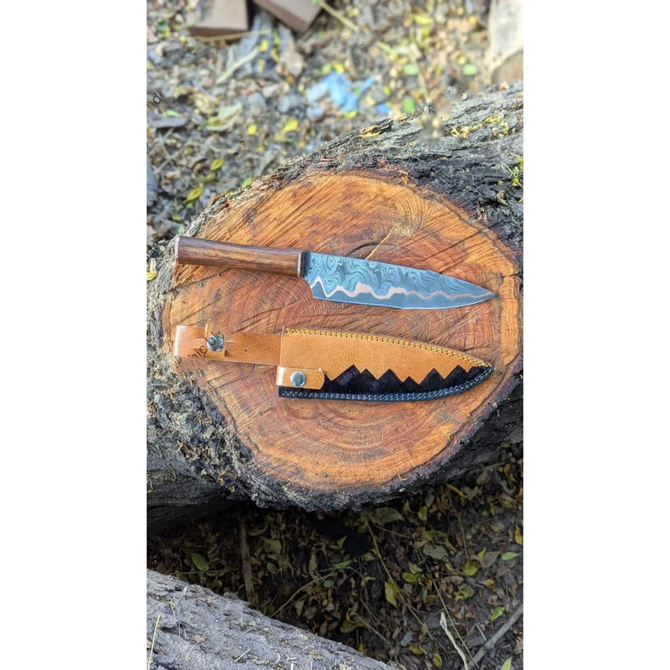 Cuchillo de Chef Burraq, Hecho a Mano con Acero de Damasco, Hoja de 7 Pulgadas, Grosor de 3.0 mm, Mango de Madera, Funda de Cuero Premium, Nuevo