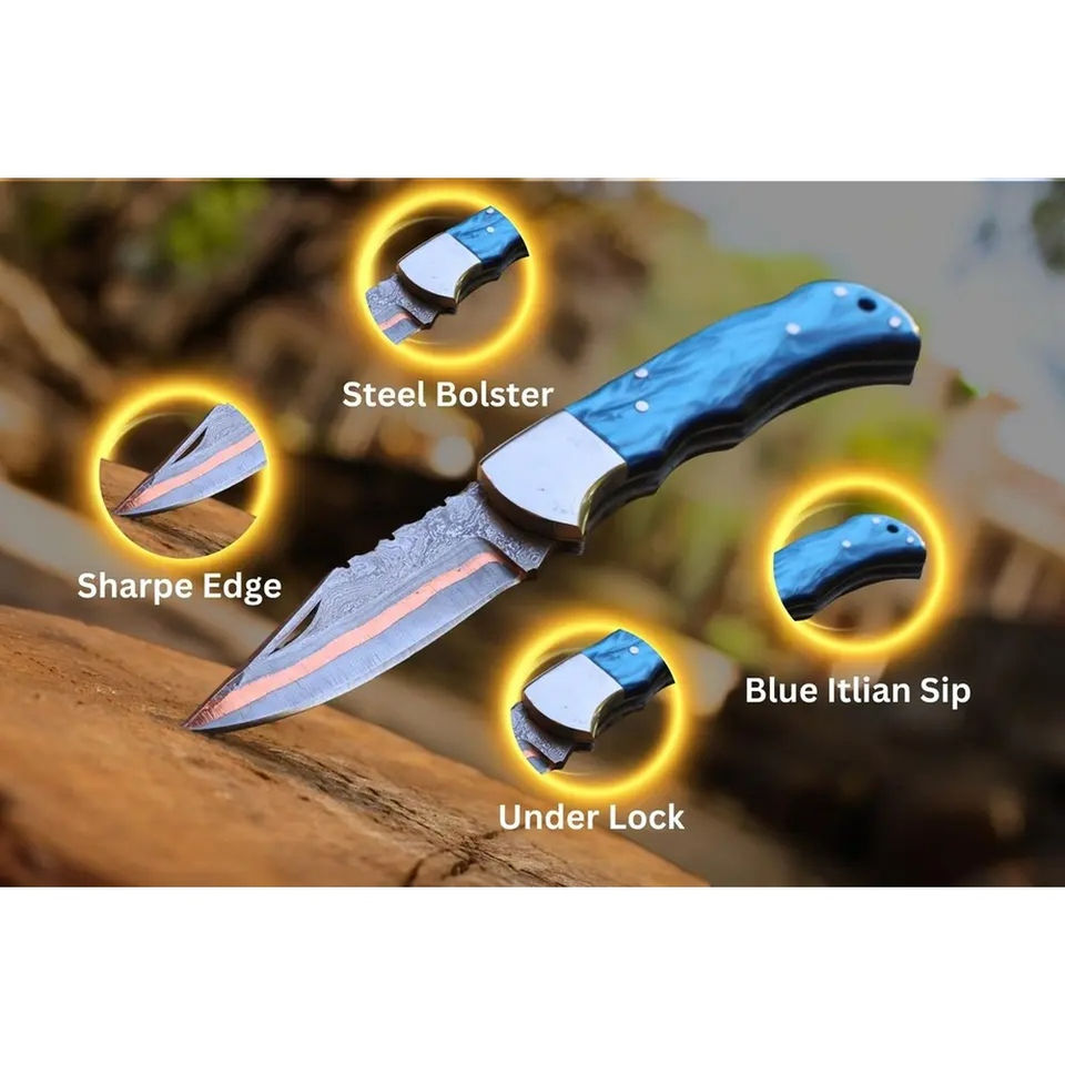 Cuchillo de Bolsillo Deslizante Multifuncional de Acero de Damasco de 8 Pulgadas, Hecho a Mano, Personalizado, con Funda de Cuero, Regalo de Aniversario