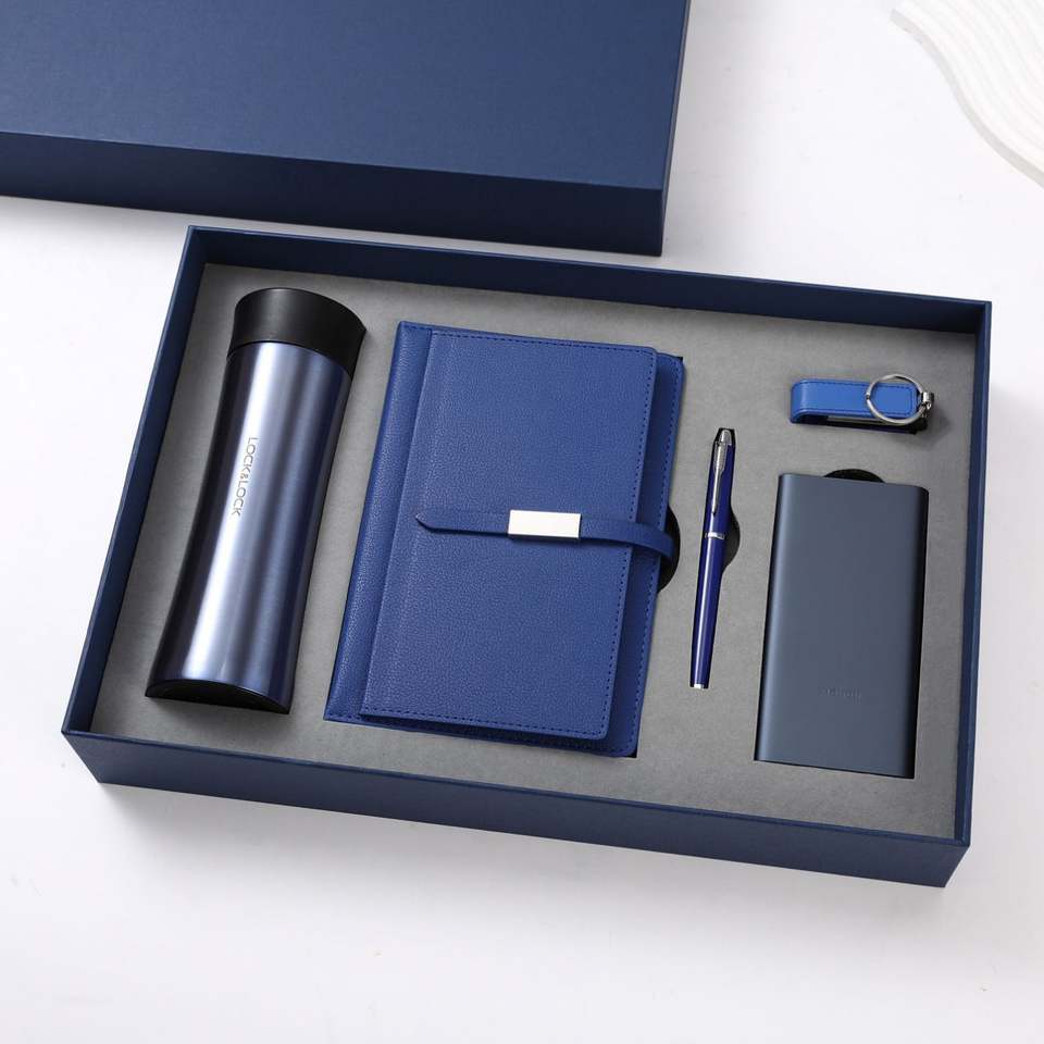 Set de Regalo de Oficina Moderno y Sencillo: Libreta Azul con Cierre, Batería Externa de Acero Inoxidable y Memoria USB, Hecho en China, Ideal para Aniversarios