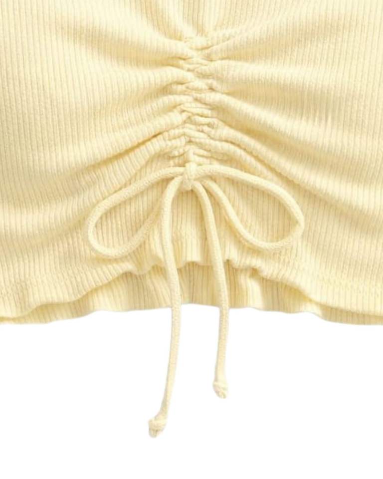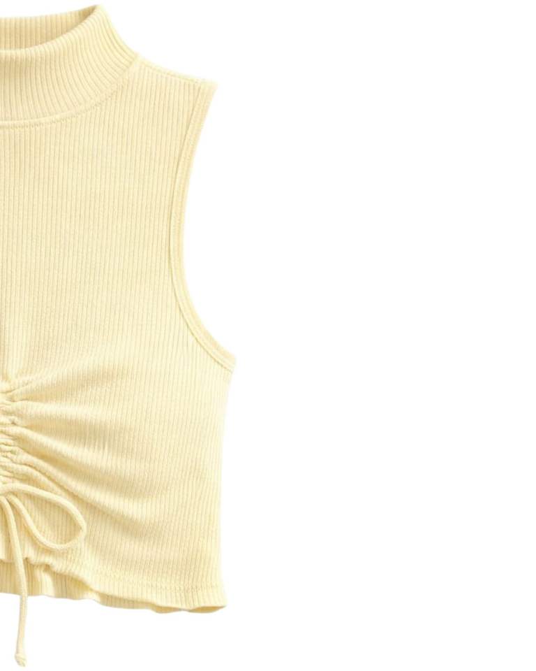 Top Corto Sin Mangas con Cuello Alto Acanalado en Amarillo Mantequilla, con Cordón Ajustable y Fruncido Delantero, Ajuste Ceñido, Estilo Casual para Mujer